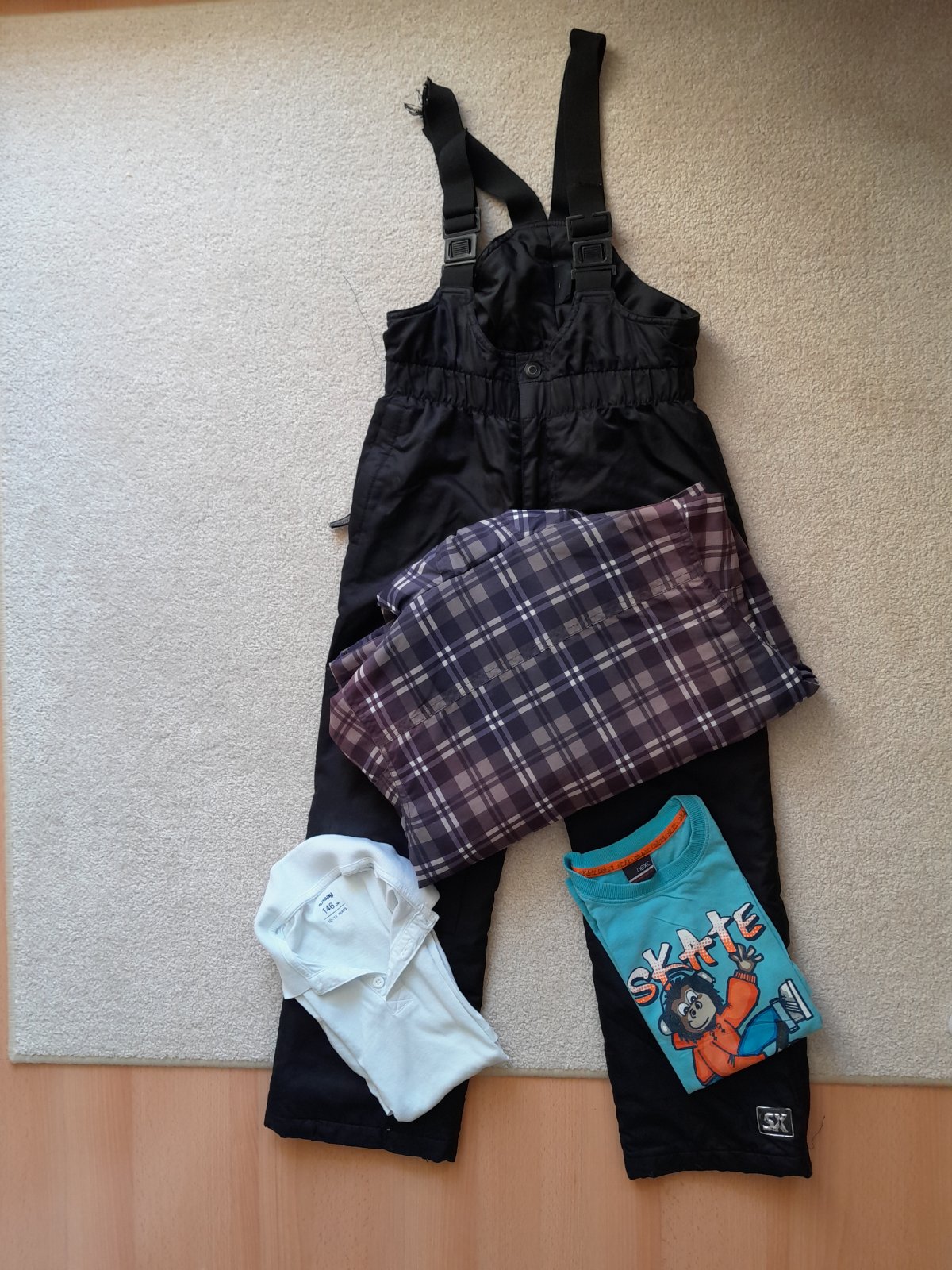 Prodám zimní set, vel. 134/140. Skládá se z bundy značky CA a oteplováků značky Snoxx. Bunda má odnímatelnou podšívku ve formě mikiny, takže bez ní lze nosit i jako podzimní/jarní bundu. Synova oblíbená, takže na některých místech drobné vady, ale na hřišti ještě udělá skvělou službu. Šířka 44 cm, délka 53 cm. Vel. uvedena 134, ale je větší. Oteplováky na některých místech seknuté od lyží a jeden popruh se páře - na funkci nemá vliv. Vše nafoceno a zohledněno v ceně. Zdarma přidám dvě trička.