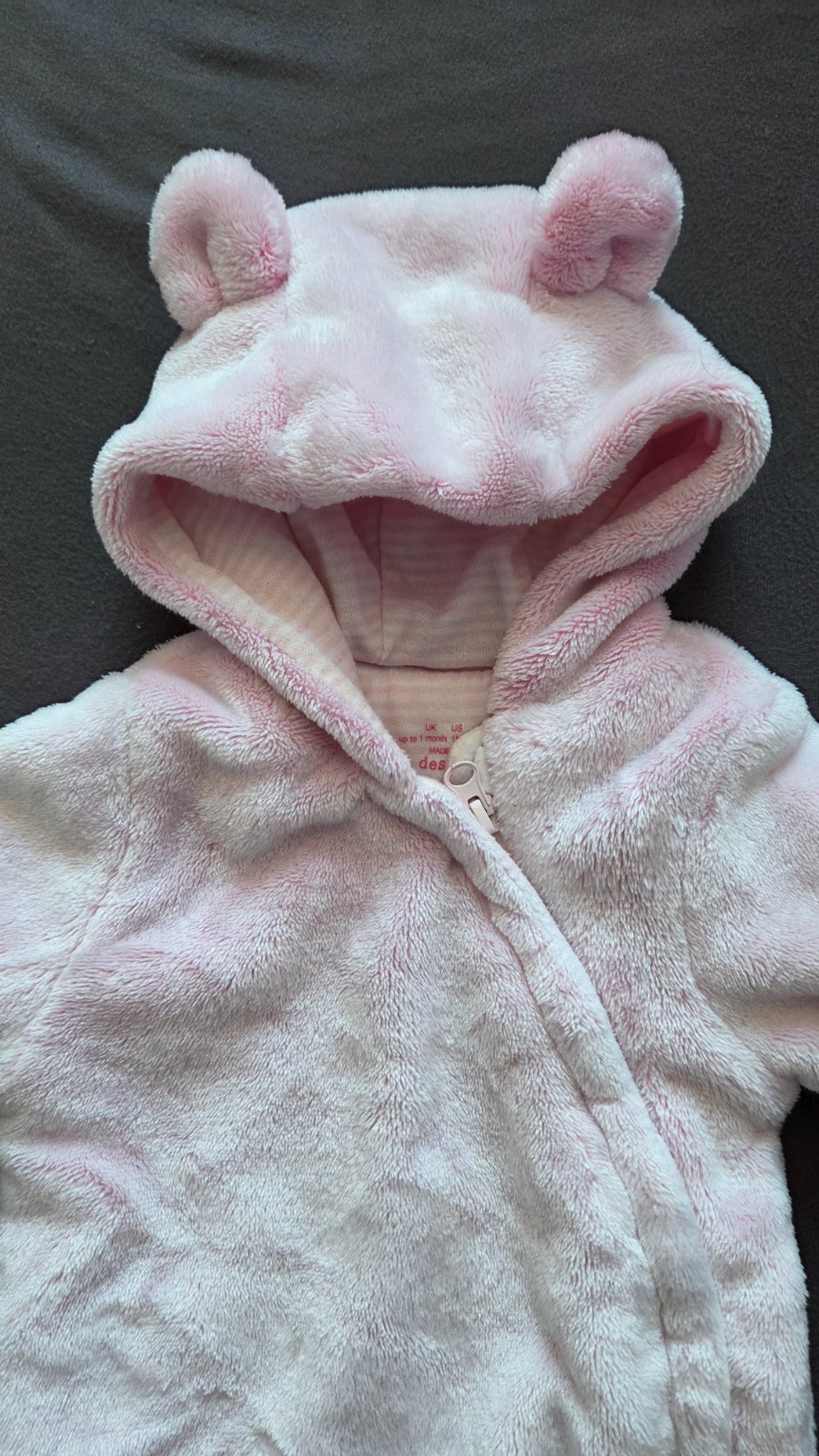 Oblečený asi 2x. Top stav, bez chyby. celková délka 49cm, délka rukávu od kapucky 28cm, délka vnitřní strana nohavic 16cm. Moc hezké, doporučuji.