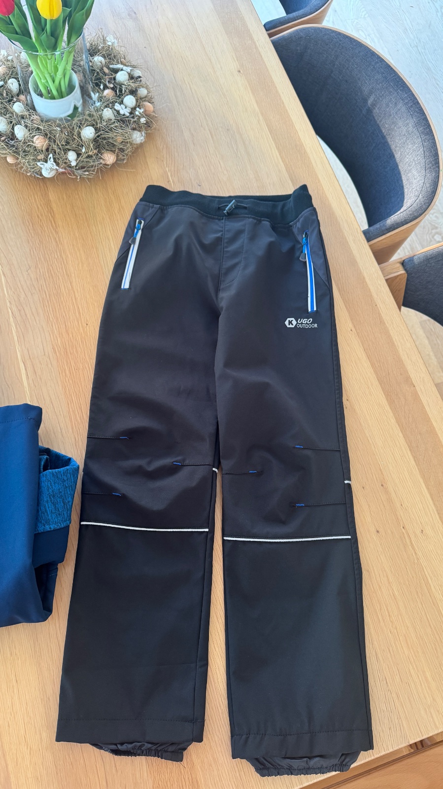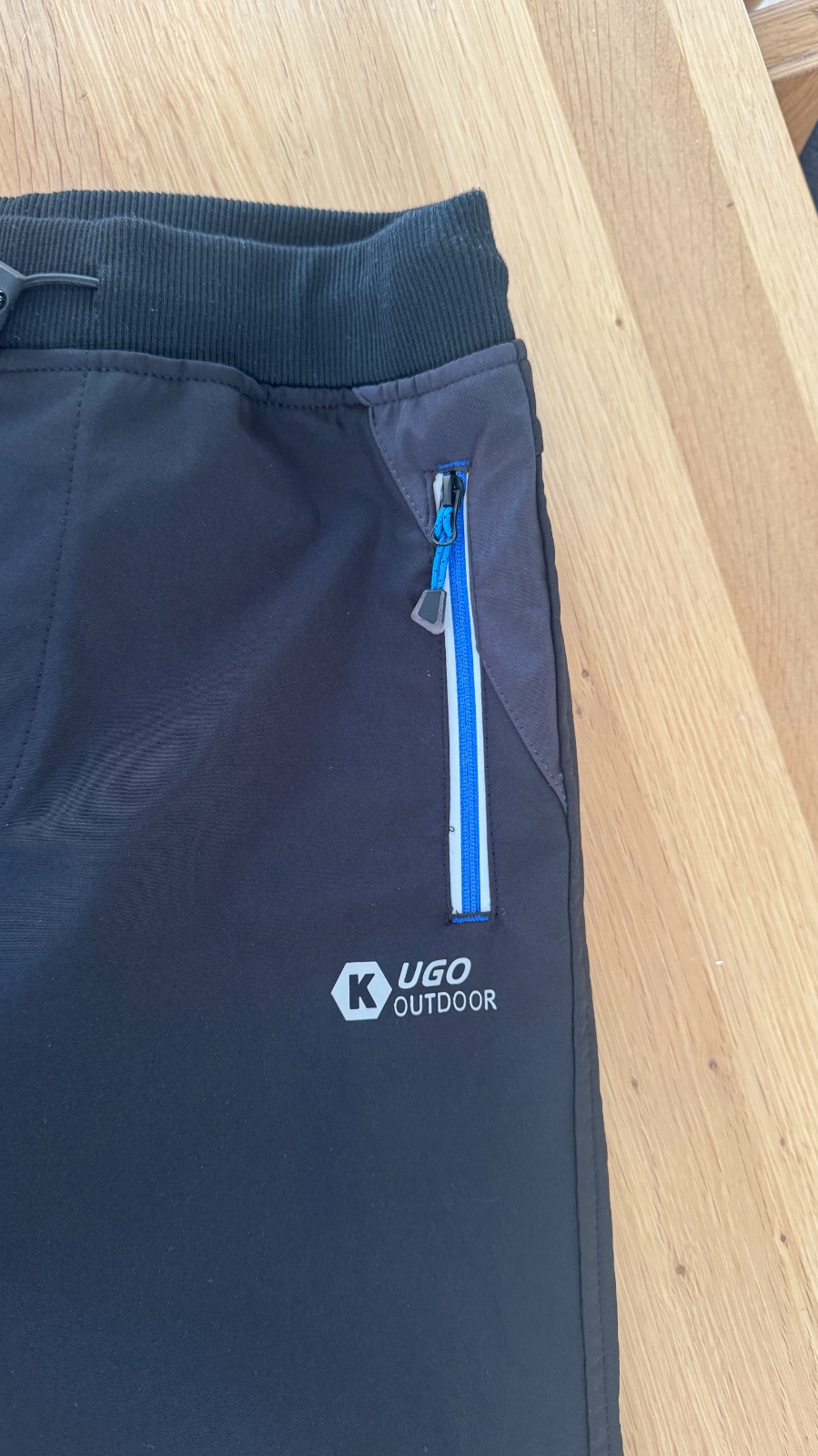 Zateplené fleesem. V pase na gumu. 2 boční kapsy na zip. Pas 2x 35-50 cm, délka nohavice 110 cm