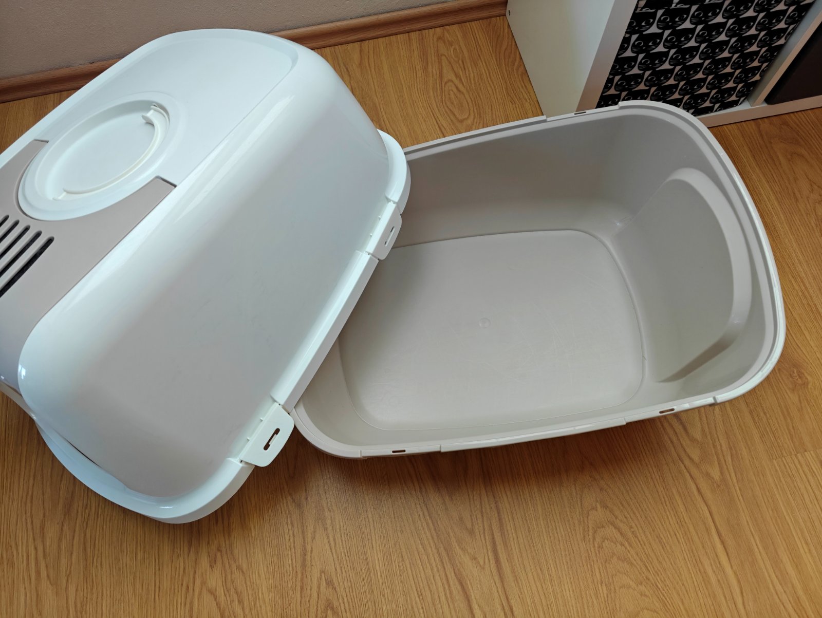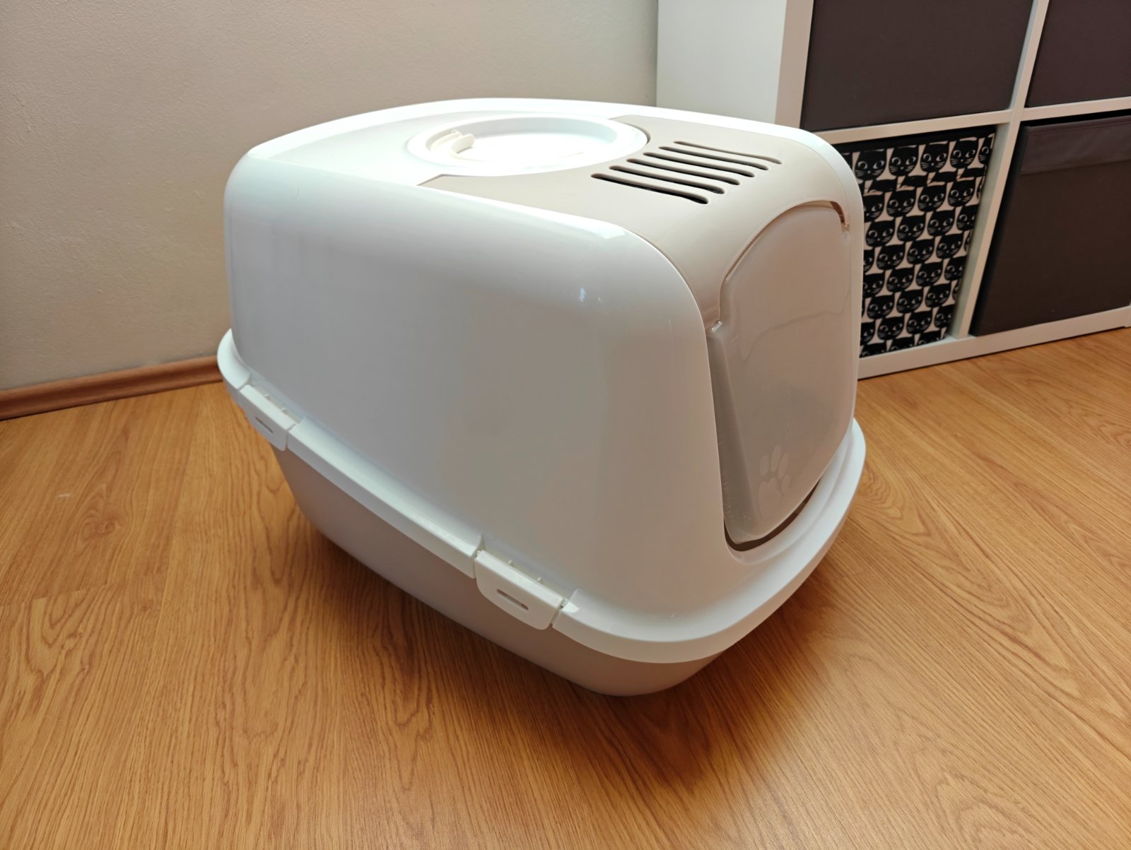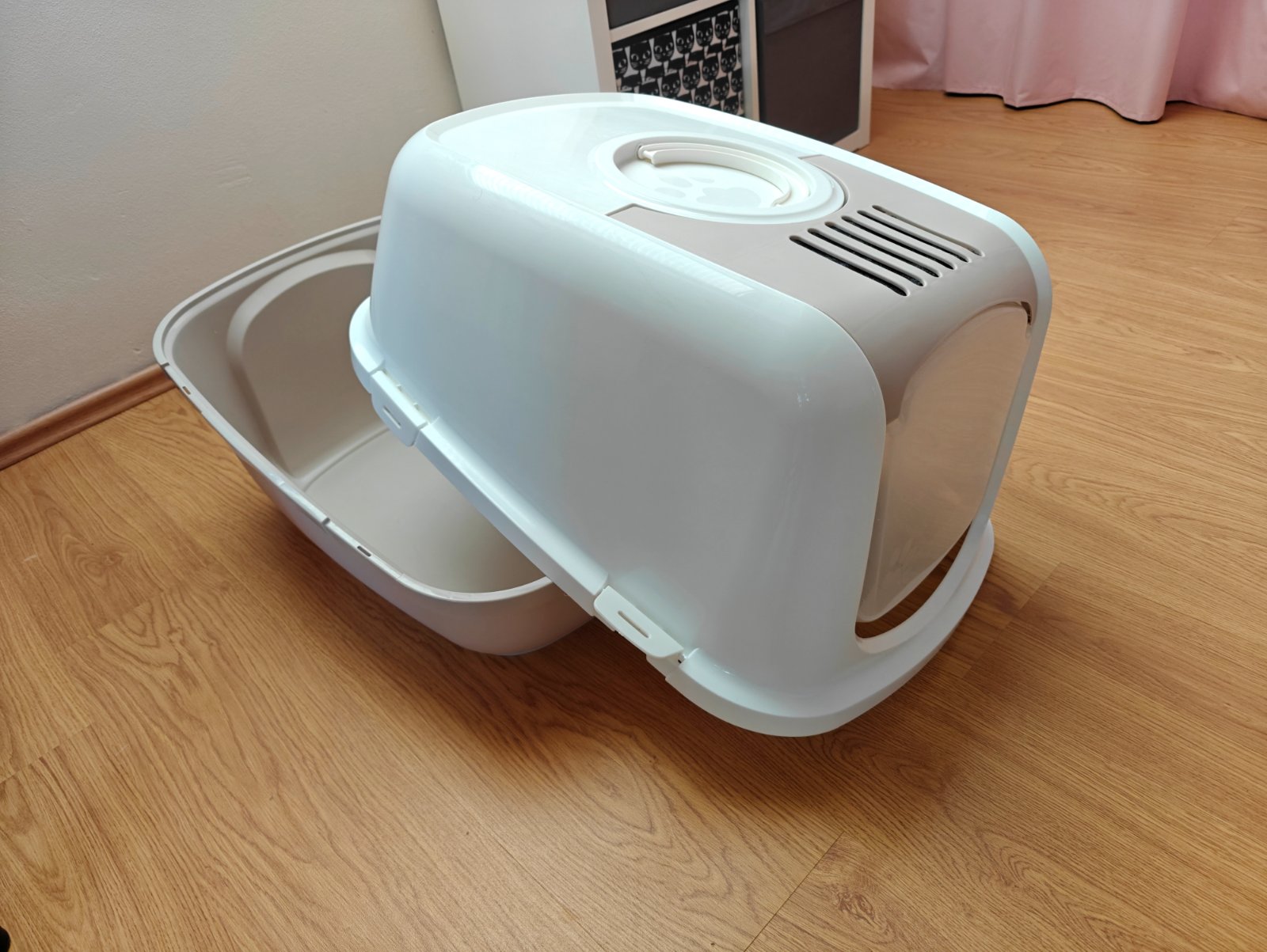 Veliká zakrytá kočičí toaleta v bílo kávové barvě. Vhodné pro velká plemena nebo více koček v domácnosti.