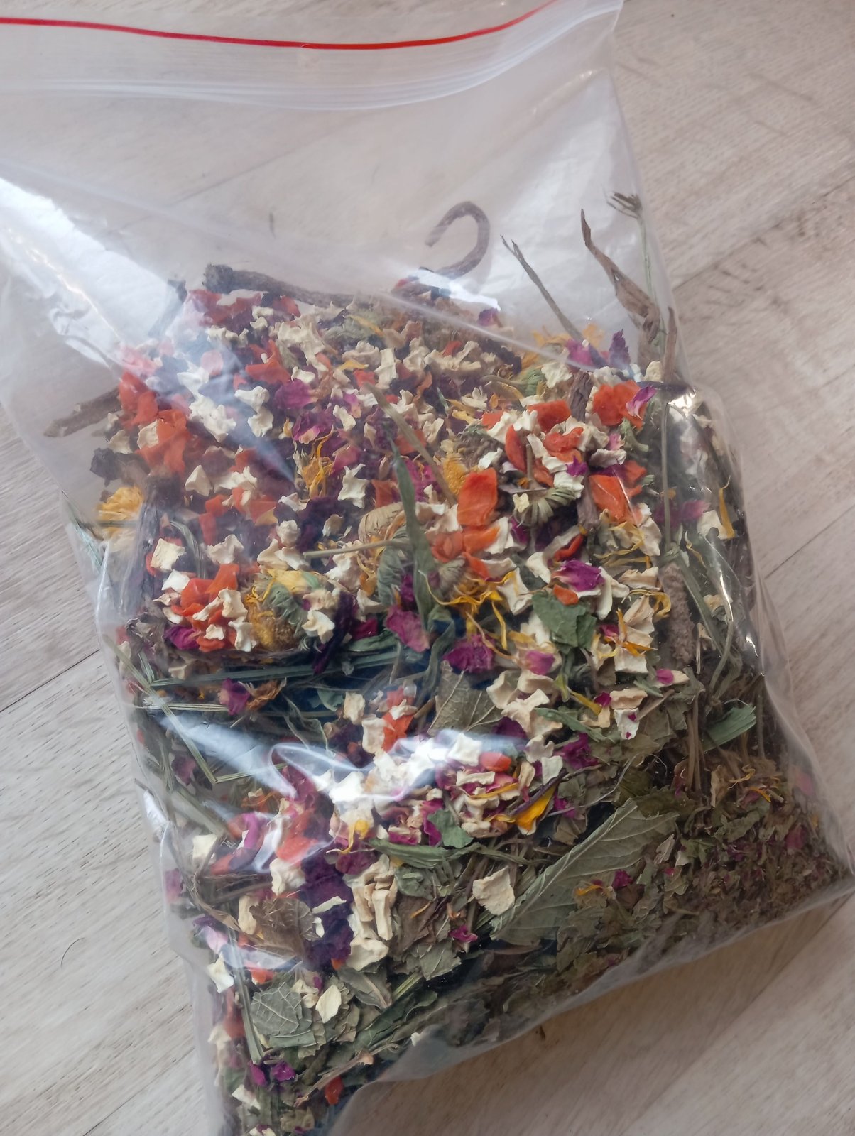 Nabízím 100%ně přírodní krmnou směsku pro králíčka,balení 250g obsahuje... sušená zelenina: mrkev, celer, petržel, řepa, dále sušený list pampelišky, rybízu, jahody a jitrocele. Dále květ měsíčku a lístky růže..