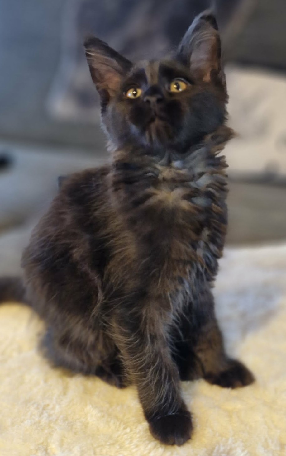 Patty LaBelle de Euphory je 11ti týdenní mainská mývalí kočička s černým zbarvením a jemnou bílou náprsenkou, která jí dodává něžný vzhled. Je skvělá parťačka, velice ráda tráví čas v blízkosti lidí a moc ráda se mazlí. Je zvyklá na kočičí záchod, naočkovaná, očipovaná, pravidelně odčervená a samozřejmě s PP. Do nového domova si odnese malý startovací balíček. K odběru bude připravená v polovině dubna. Hledáme pro ni láskyplný domov:)