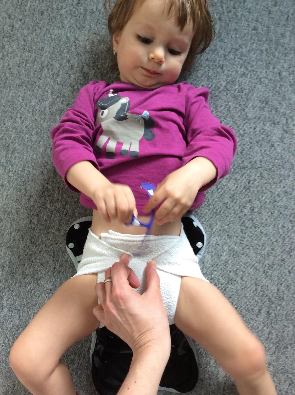 5. Na střed pleny položíme dítě a spodní část kalhotkového skladu přehneme přes bříško, přidržujeme rukou.