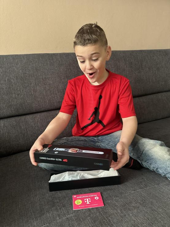 Krokoměr ho motivuje k pohybu – sleduje si, kolik kroků ušel a porovnává se s bratry a se mnou. Rád používá také záznamník zvuku a často si něco namluví, jen tak pro zábavu. Videohovory miluje – někdy mi volá z dětského pokoje do obýváku jen proto, že ho to baví.