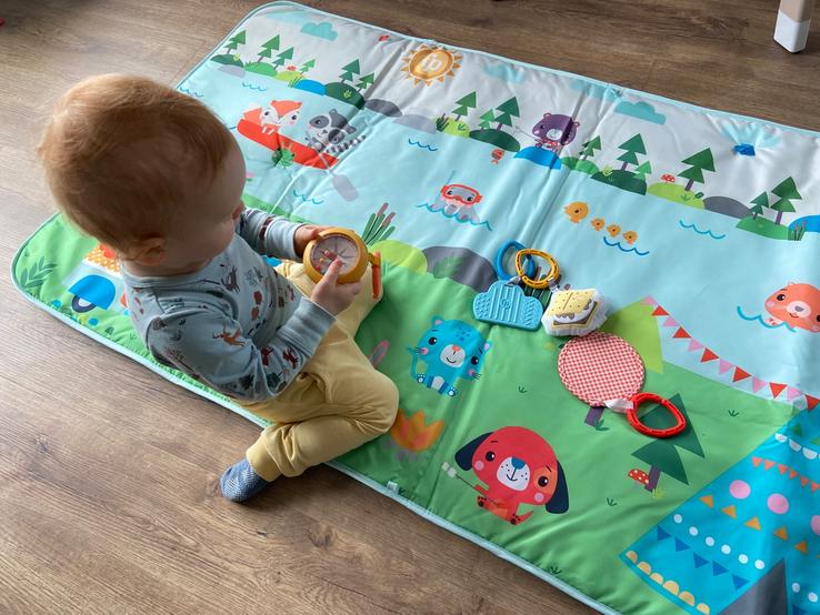 Největší hrací podložka od Fisher-Price s řadou doplňků nás okouzlila na první pohled. Vzor kempování je koukavý, k dečce je možné zaháknout 4 hračky (nikde se vám neválí mimo deku) a najdete na dečce i prvky pro další zlepšování motoriky.