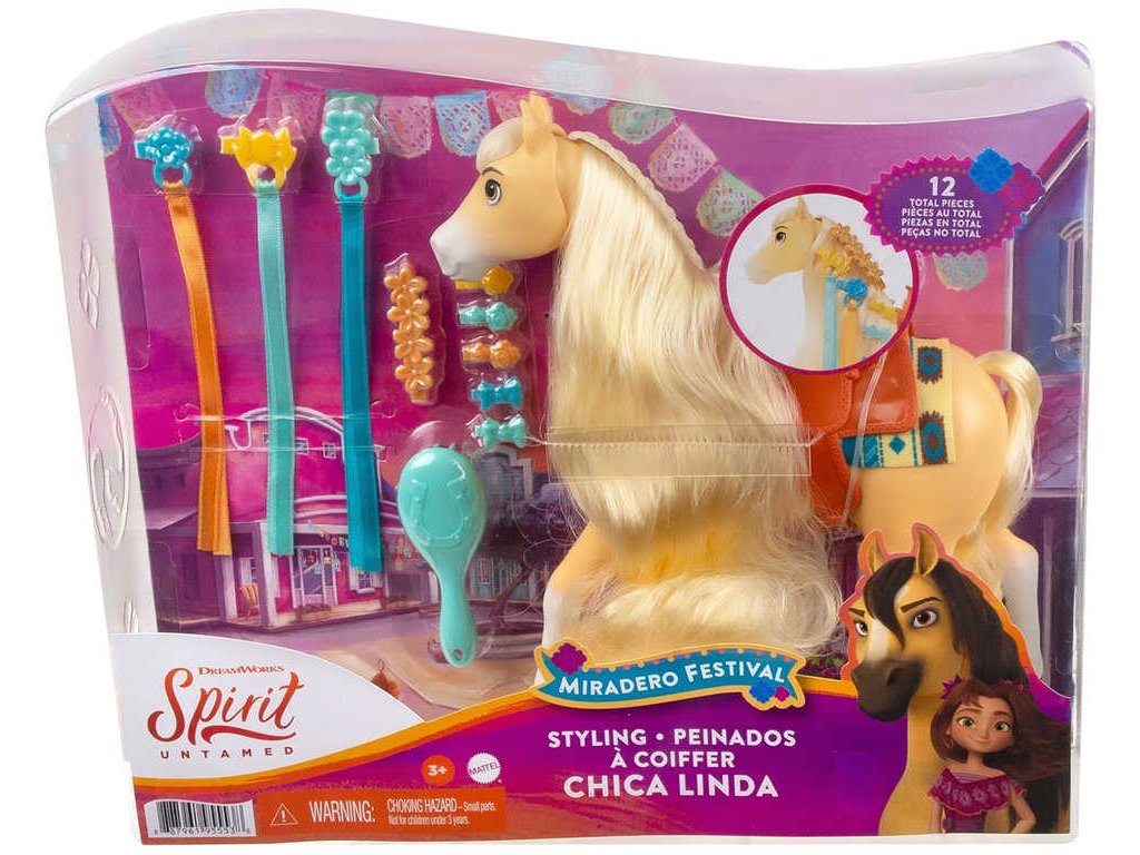 Mattel Spirit Fancy festival klisna Linda je krásný kůň, který se vyznačuje vysokým leskem. Zdobí ji dlouhá třpytivá hříva, kterou děti mohou ještě vylepšit barevnými doplňky (jsou součástí balení). Ke klisně patří i festivalová koňská deka, kartáč pro česání hřívy a vlasové květinové doplňky, které lze použít nejen na hřívu, ale i dlouhý ocas.