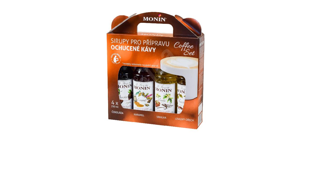 Monin Coffee box 4 x 250 ml je sada 4 sladkých sirupů pro přípravu ochucené kávy. Obsahuje varianty: čokoláda, vanilka, karamel a lískový oříšek. Využít je lze ale i pro mléčné nápoje a koktejly.