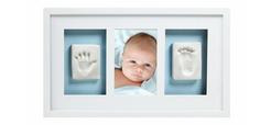 V sadě PEARHEAD nástěnný trojrámeček na otisk se nachází tři rámečky v nástěnném trojrámečku o rozměrech 42 cmx24 cm určené na fotografii miminka a otisky nožičky i ručičky.