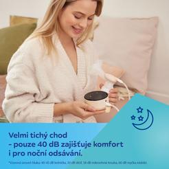 Ergonomický tvar trychtýře se přizpůsobí různým tvarům prsou, takže proces odsávání mateřského mléka připomíná ten přirozený. Trychtýř s měkkou, profilovanou masážní vložkou z jemného silikonu nedráždí citlivé bradavky a zvyšuje komfort při odsávání mléka. Odsávačka mateřského mléka je vybavena přehledným displejem, který informuje o režimu, úrovni výkonu a úrovni nabití baterie. Dotykový ovládací panel se snadno používá a pamatuje si poslední použitá nastavení.