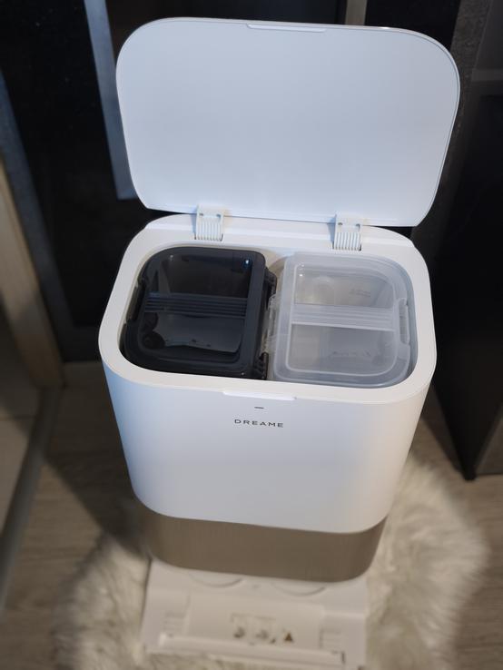 Do dokovací stanice se lije i speciální čistící prostředek, který si Dreame dávkuje sám. Co je ale podle mě úplně unikátní, je způsob, jakým si mop sám myje. Když mop zjistí, že je příliš špinavý, sám se vrátí na základnu, kde ho automaticky umyje – a to horkou vodou. Mop je tak opravdu čistý. Po každém úklidu se mop ještě vysuší teplým vzduchem, takže hadřík nikdy nezapáchá. Další bonus – robot má dvě nádobky: jedna je na čistou vodu, druhá na špinavou. Podlaha je vždy vytírána čistou vodou a špinavou si robot nasává zpět.