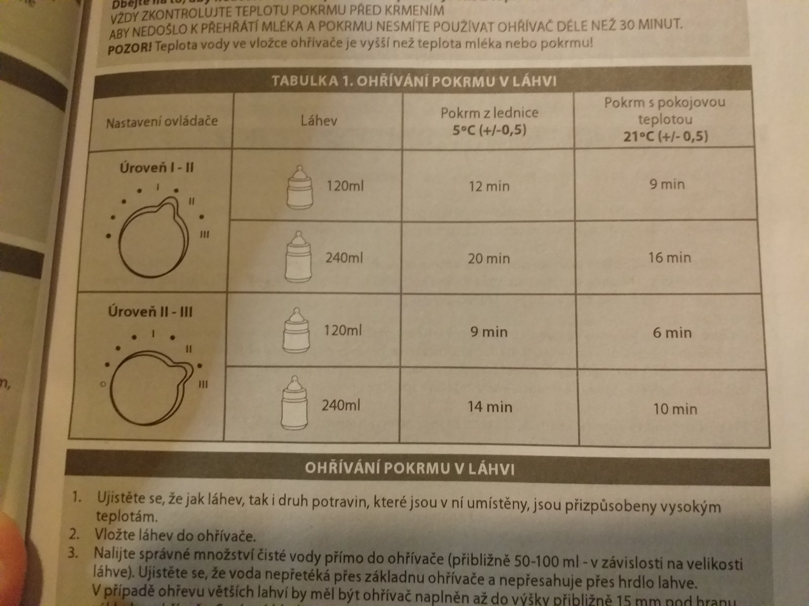 Ohrivacka pusobi neutralnim dojmem, pro nekoho, kdo resi, jak to u nej doma vypada a ma rad barvicky, aby vsechno ladilo, je to urcite podstatny detail 😉 .. Velikost je tak akorat a tak nezabira na lince ani moc mista. Ohrivacka ma 2 moznosti ohrevu, bud ohrivate v hrdle s vodou primo kojeneckou lahvicku s mlickem/vodou/cajikem/presnidavku ve skle/v kapsicce k tomu urcene, nebo primo v plastove misticce urcene k ohrevu pokrmu. Je dulezite neprehnat mnozstvi vody, ale ani nedat malo, mnozstvi se pohybuje kolem 50-100ml. A jde se na vec, na ohrivacce sviti 2 kontrolky. Oranzova znamena, ze je ohrivacka zapnuta a zelena se zapne ve chvili, kdy ohrivacka zacne ohrivat. Behem zahrivani se nekolikrat vypne a zapne, neznamena to ale, ze teplota dosahla nastavene teplote. Prikrm nebo mlicko je i tak dulezite kontrolovat a michat, aby doslo k rovnomernemu prohrati celeho mnozstvi. V tabulce naleznete orientacni cas doby ohrevu a na jaky stupen je spravne ohrivacku nastavit. Super je, ze si to vsechno nachystate, zapnete a v klidu si muzete delat neco sveho, behem parkrat zamichat a je hotovo 🙂 ..