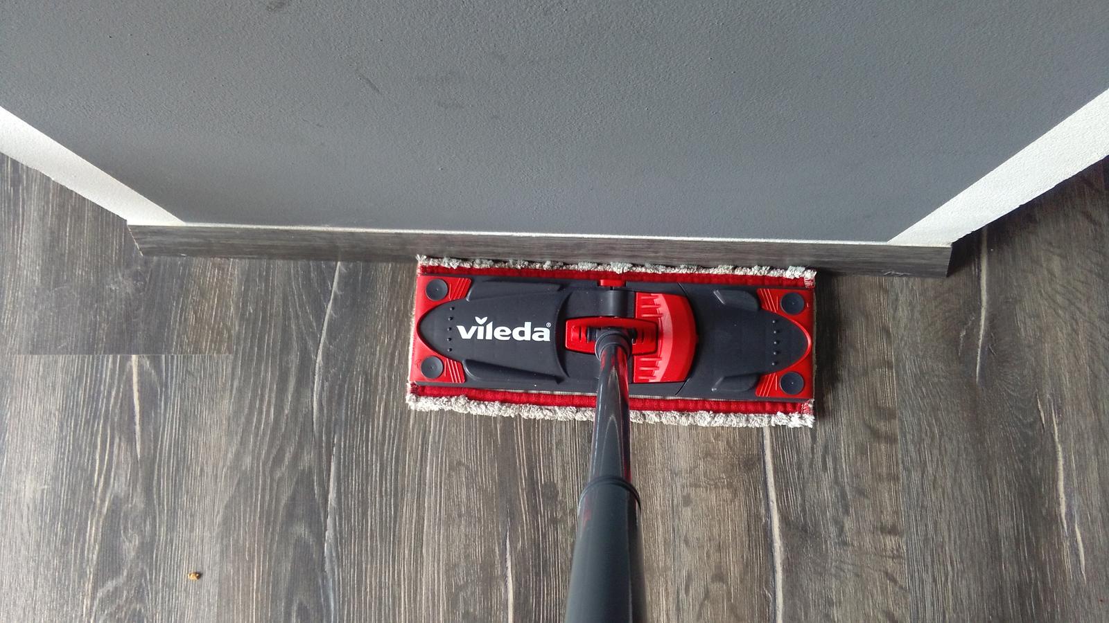 První přišel na řadu obývací pokoj s kuchyní, kde máme protiskluzovou plovoucí podlahu s mírnou protiskluzovou strukturou. Výsledek? Nádhera. Vileda mop nevynechal žádný kout. Super plochý mop je schopný zajet do rohů, pod skříňky, pod gauč a nevynechá ani podlahové lišty.